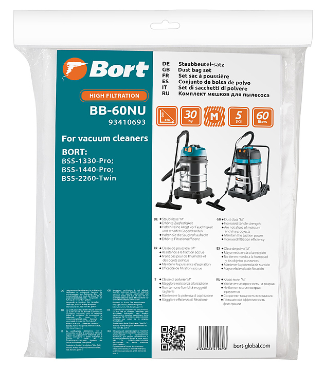 Комплект пылесборных мешков Bort BB-60NU используется совместно с пылесосами BSS-1330-Pro, BSS-1440-Pro и BSS-2260-Twin для сбора мельчайших частиц пыли, влаги и строительного мусора. Изделия выполнены из многослойной синтетической ткани высокой плотности. Характеристики: