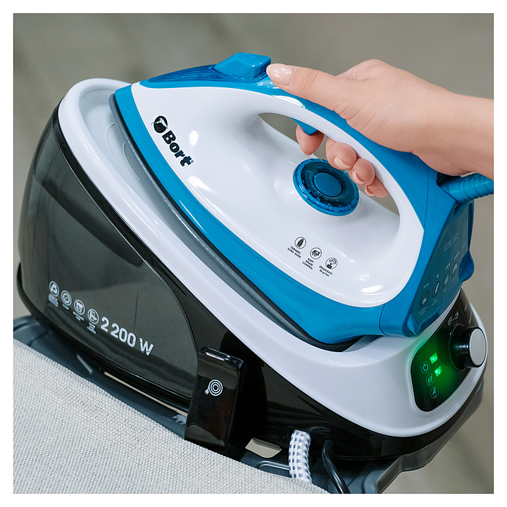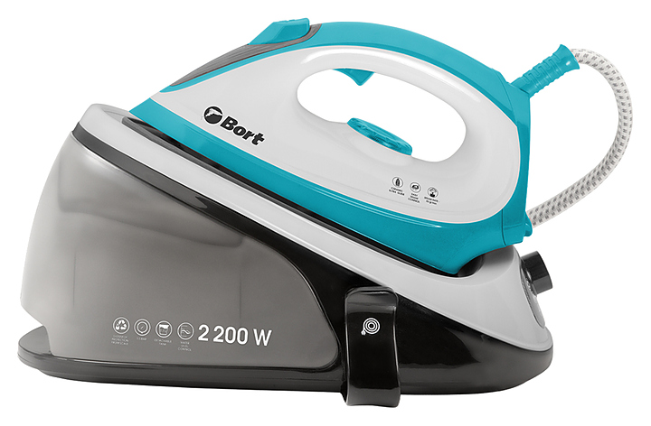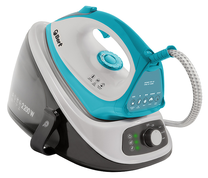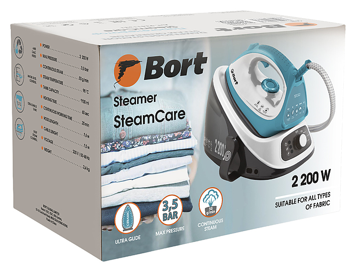 Парогенератор Bort SteamCare предназначен для влажно-тепловой обработки постельного белья, скатертей, штор и одежды в частных домах и квартирах. Модель оснащена паровым утюгом с керамической подошвой и съемным резервуаром для воды. Особенности: