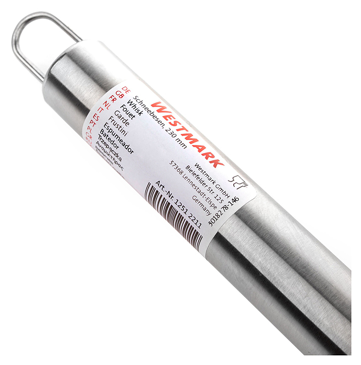 Венчик Westmark 12512211 используется на предприятиях общественного питания и торговли для ручного взбивания соусов, кремов, муссов и других смесей. Изделие имеет фиксированную ручку с петлей на конце для удобного хранения. Дополнительные характеристики:
