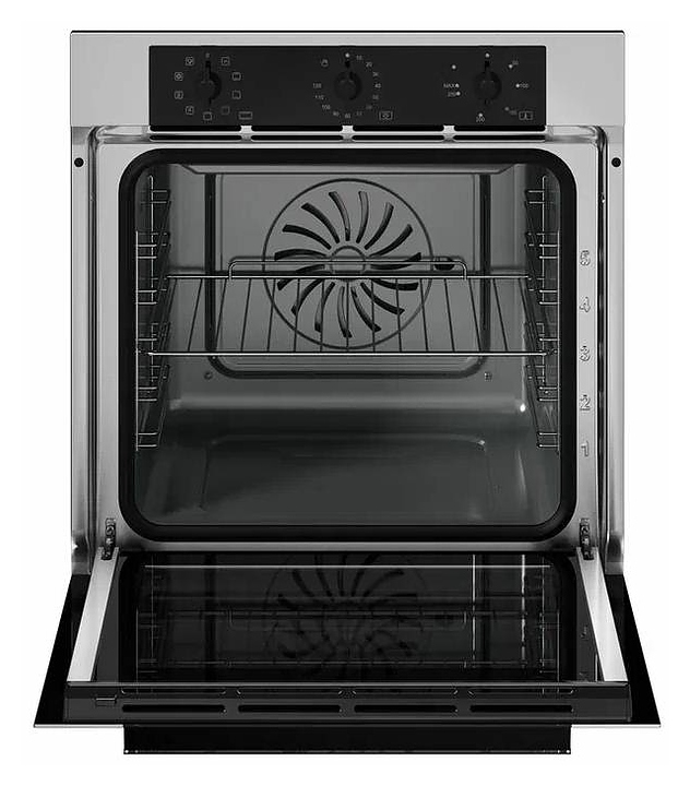 Электрический духовой шкаф Bertazzoni F609MODEKX предназначен для приготовления большого ассортимента блюд в домашних условиях. Модель оснащена вместительной камерой с вентилятором в задней стенке, грилем, 2 съемными стойками с 5 уровнями направляющих для противней, герметичной дверью с прямоугольным смотровым окном, горизонтальной рукояткой и 3 поворотными переключателями. Корпус выполнен из высококачественной нержавеющей стали, направляющие – из металла с хромированным покрытием, переключатели – из металла с мякким покрытием Soft Touch, облицовка камеры – серая пиролитическая эмаль, покрытие рукоятки и верхней панели – стекло. В комплект поставки входят стандартный эмалированный противень и усиленная решетка для гриля. Особенности: