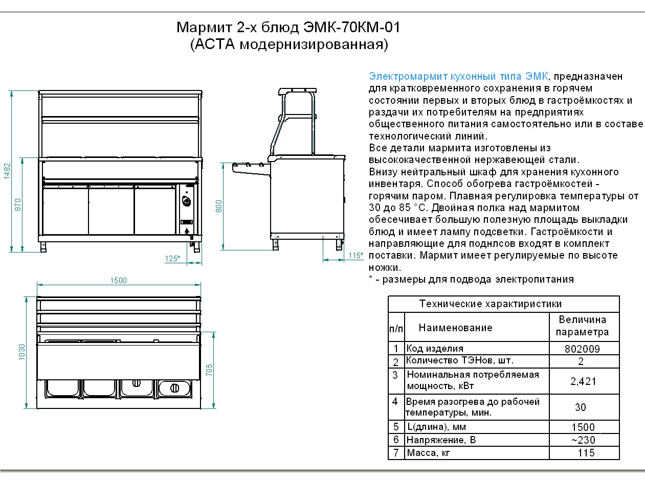 Мармит Abat ЭМК-70КМ-01 используется в составе линии раздачи Аста для демонстрации, кратковременного хранения и поддержания вторых блюд в горячем состоянии в составе линий раздач на предприятиях общественного питания и торговли. Модель оснащена регулируемыми по высоте ножками. Столешница выполнена из нержавеющей стали. Особенности:
