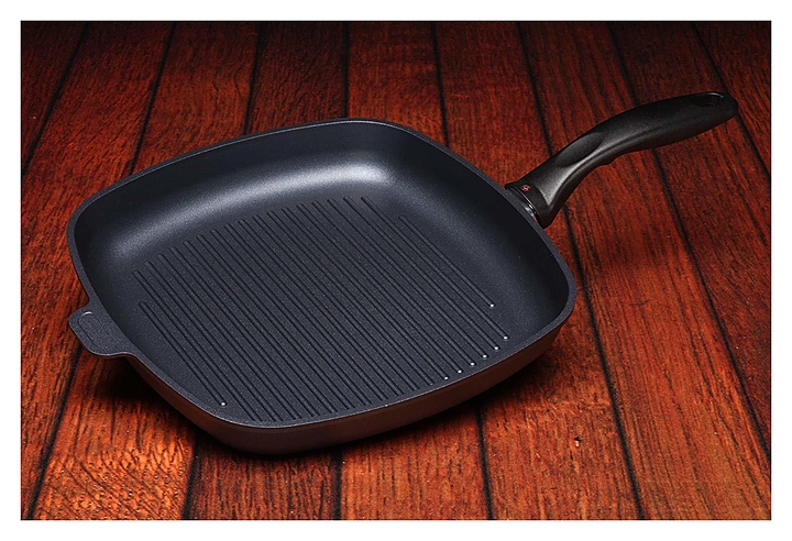 Сковорода-гриль Swiss Diamond XD 63281 предназначена для приготовления широкого спектра блюд на любых типах варочных поверхностей кроме индукционных на предприятиях общественного питания и торговли, а также в домашних условиях. Модель оснащена дном с канавками для стекания масла, сбалансированной фиксированной рукояткой с отверстием для подвешивания и небольшой вспомогательной ручкой. Корпус прямоугольной формы выполнен из сплава алюминия и кремния методом литья под высоким давлением с последующей пескоструйной шлифовкой и плазменным напылением для усиления адгезии внешнего покрытия, рукоятка – из термостойкого бакелита. Особенности: