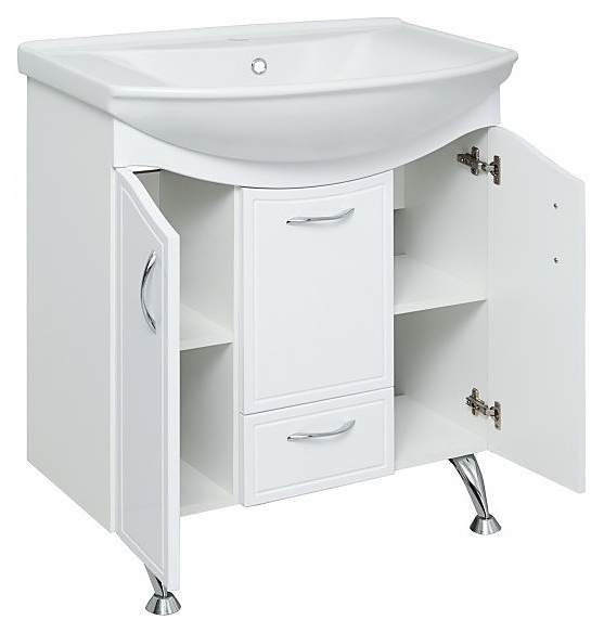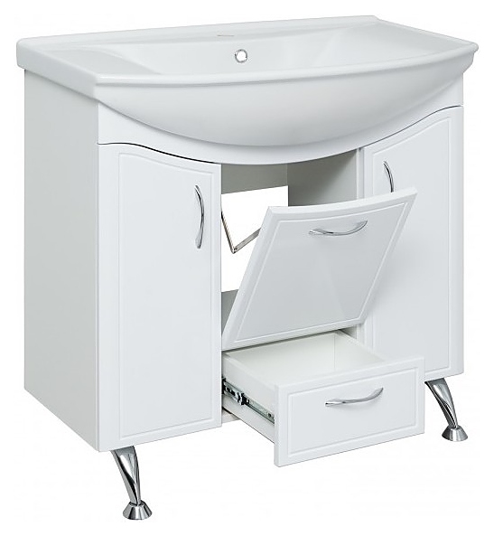 Тумба под раковину Runo Севилья 85 выполнена в современном стиле и идеально впишется в интерьер любой ванной комнаты. Модель оснащена 2 распашными дверями, откидной дверью и выдвижным ящиком на шариковых направляющих. Корпус выполнен из влагостойкой ЛДСП, фасад - из МДФ с пленкой ПВХ. Тумба используется вместе с раковиной Kirovit Стиль 85. Комплект поставки: