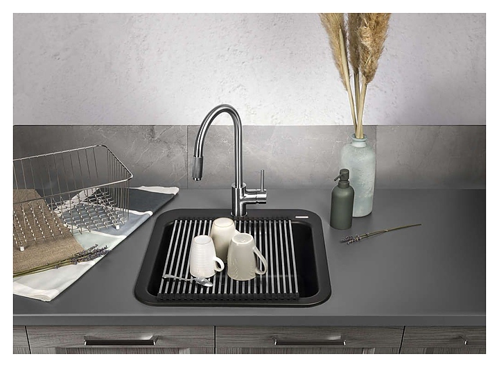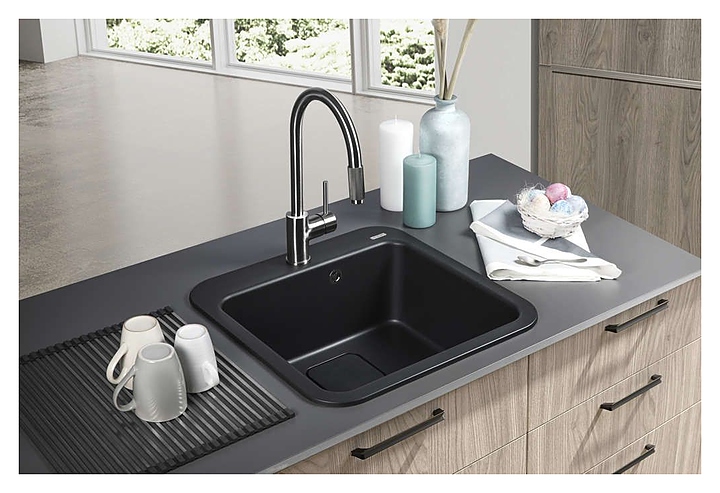Кухонная мойка Omoikiri Tasogare 51-BL предназначена для установки в частных домах, квартирах, офисах, отелях, гостиницах и на различных предприятиях для мытья столовых принадлежностей, посуды, приборов, инвентаря и продуктов питания. Изделие выполнено из искусственного гранита ARTGRANIT®, который является сочетанием твердых частиц кварца и гранита, а также прочного связующего полимера. Покрытие имеет гладкую поверхность и очень плотную структуру, не позволяющую каплям жидкости и грязи проникать глубоко внутрь мойки, отталкивая частицы воды. В комплект поставки входят сифон, донный клапан и крепления. Особенности: