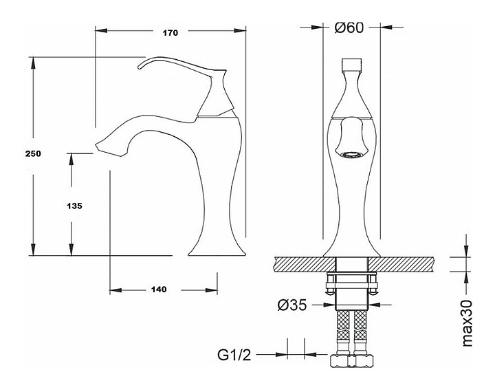 Смеситель для раковины Bronze de Lux Pure A9143 предназначен для подачи горячей и холодной воды в ванных помещениях. Модель оснащена керамическим картриджем, обеспечивающим плавный ход рычага смесителя, контроль и точность при выборе напора и температуры воды. Изделие выполнено из латуни, которая отличается прочностью, долговечностью и устойчивостью к перепадам температуры. В комплект поставки входят смеситель, гибкая подводка и монтажный набор. Особенности: