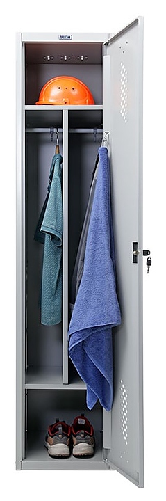 Шкаф для одежды ПРОМЕТ Практик Стандарт LS-11-40D используется на предприятиях общественного питания и торговли. Модель оснащена секцией, резделенной на 2 части, 2 полками и замком. Корпус выполнен из стали, окрашенной методом порошкового напыления. В комплект поставки входят полки, перекладины, крючки, крепеж и ключевой замок «Практик». Особенности:
