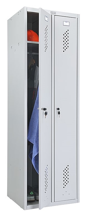 Шкаф для одежды ПРОМЕТ Практик Стандарт LS-21 используется на предприятиях общественного питания и торговли. Модель оснащена 2 секциями, 2 полками и замками. Корпус единый, выполнен из стали, окрашенной методом порошкового напыления. В комплект поставки входят полки, перекладины, крючки, крепеж и ключевые замки «Практик». Особенности: