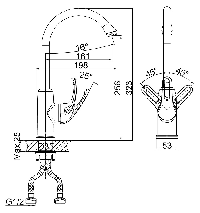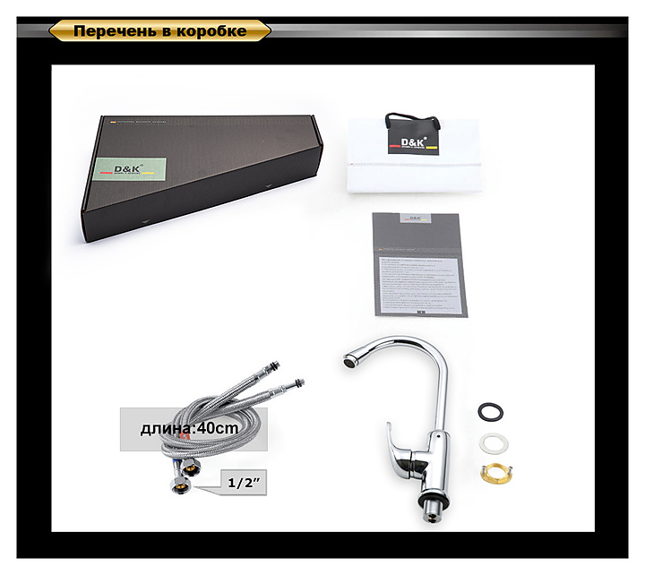 Смеситель D&K Rhein Eucharius DA1372401 предназначен для использования в кухонных помещениях для подачи горячей и холодной воды. Модель оснащена высоким поворотным изливом, керамическим картриджем, обеспечивающим плавный ход рычага смесителя, контроль и точность при выборе напора и температуры воды, а также аэратором для создания мягкой ровной струи без разбрызгивания. Изделие выполнено из высококачественной латуни, отличающейся прочностью, долговечностью и устойчивостью к перепадам температур. В комплект поставки входят cмеситель, гибкая подводка и крепежные гайки. Особенности: