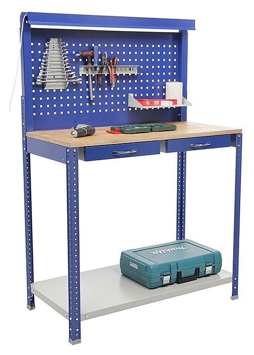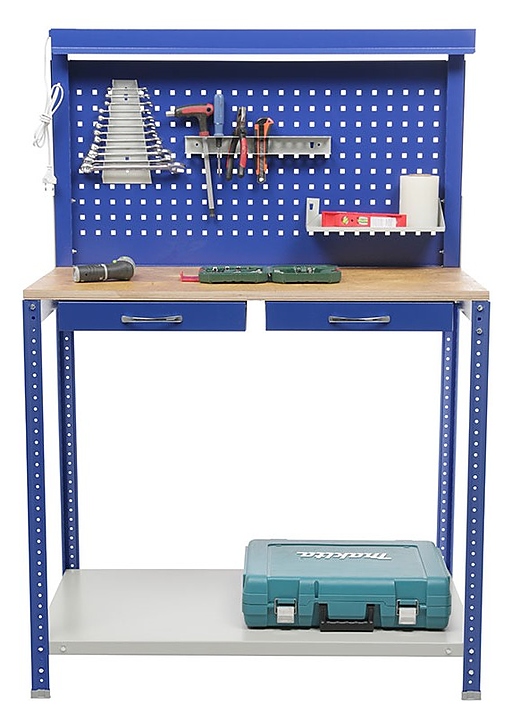 Металлический верстак ПРОМЕТ Garage Set 1 предназначен для оснащения рабочих мест на производственных участках, станциях технического обслуживания, участках сборки и комплектации, в загородных домах и технических помещениях. Модель оснащена 2 ящиками и полкой. Столешница изготовлена из фанеры, покрытой лаком, полки - из стали. Комплектация: