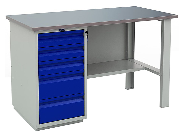Слесарный верстак ПРОМЕТ Profi (№401) WT140.WD5/F1.000 предназначен для оснащения рабочих мест на производственных участках, станциях технического обслуживания, участках сборки и комплектации, в загородных домах и технических помещениях. Модель оснащена полкой и тумбой с 5 ящиками. Столешница изготовлена из МДФ и покрыта оцинкованным листовым металлом, корпус и тумба - из металла. Комплектация: