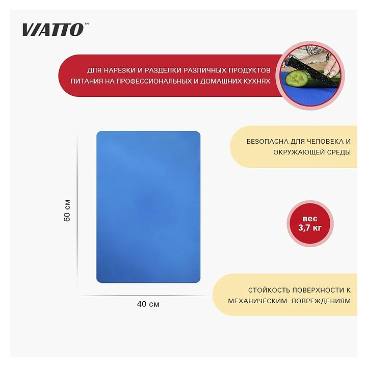 Разделочная доска VIATTO SZ6040 используется на предприятиях общественного питания и торговли, а также в частных домах и квартирах для разделки и нарезки пищевых продуктов. Изделие выполнено из полипропилена.