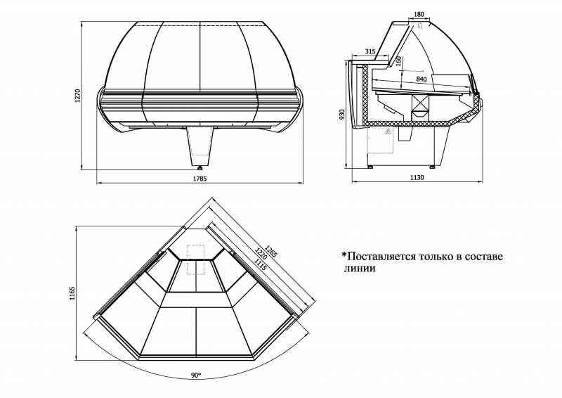 Витрина холодильная ENTECO MASTER НЕМИГА STANDART УН 90 ВС (выносной агрегат) угловая внешняя на опоре
