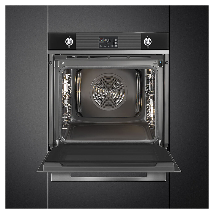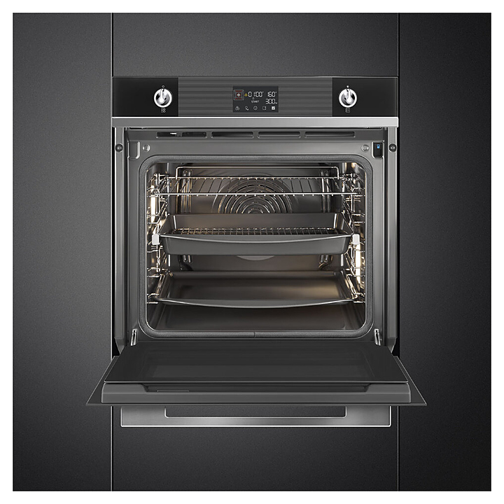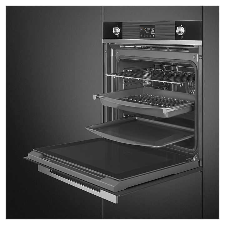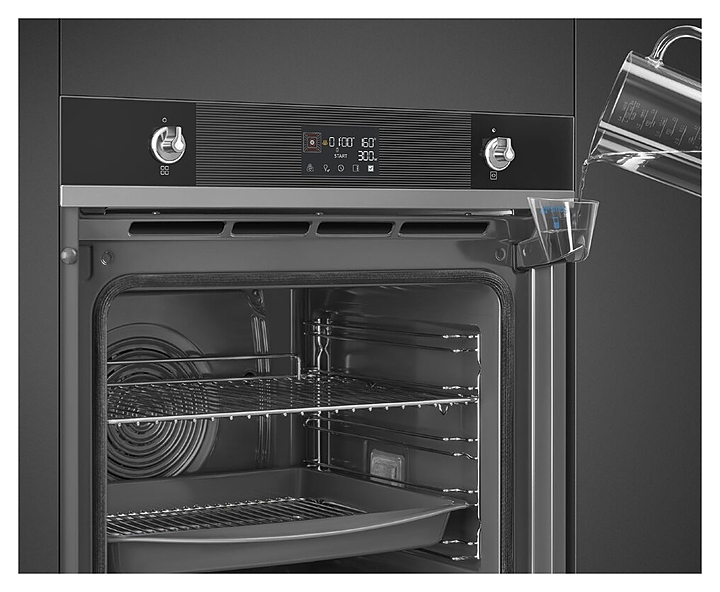 Электрический духовой шкаф SMEG SOP6102S2PS предназначен для приготовления большого ассортимента блюд в домашних условиях. Модель оснащена расположенными в задней стенке вентилятором и кольцевым нагревательным элементом, вместительной камерой Galileo, 2 съемными стойками с 5 уровнями направляющих для противней, съемным резервуаром для воды, герметичной дверью со смотровым окном и горизонтальной рукояткой, 2 поворотными переключателями и сенсорной панелью управления с жидкокристаллическим дисплеем. Корпус выполнен из высококачественной стали с полным остеклением фронтальных панелей стеклом Stopsol без винтового крепежа, верхняя панель декорирована горизонтальной металлической вставкой, направляющие – из металла. В комплект поставки входят одноточечный термощуп, стандартный и глубокий эмалированные противни, решетка для противня, решетка с ограничителем и воронка для залива воды. Особенности: