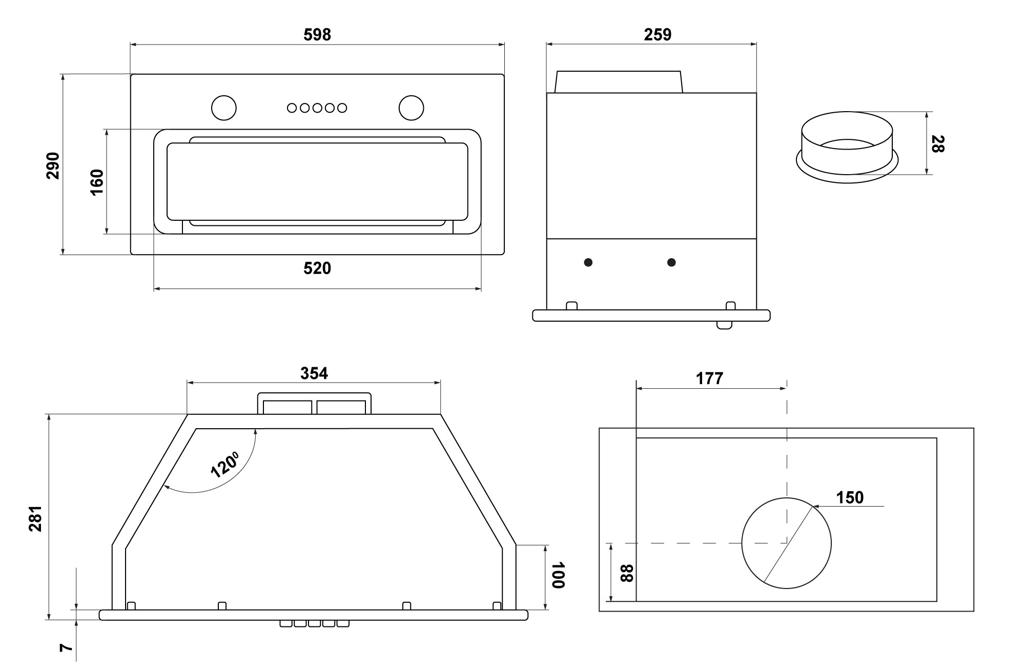 Встраиваемая кухонная вытяжка Maunfeld Trapeze 601GG предназначена для очистки воздуха от продуктов горения, копоти и запахов в процессе приготовления пищи путем принудительной вентиляции в домашних условиях. Модель оснащена электродвигателем Fime (Италия), 2 круглыми светодиодными светильниками и кнопочной панелью управления. Корпус выполнен из высококачественной нержавеющей стали, наружная часть с термостойким покрытием черного цвета, откидная панель – из закаленного стекла черного цвета с глянцевой поверхностью, фильтр – из алюминия. В комплект поставки входят набор монтажных креплений, адаптер на 120 мм с антивозвратным клапаном и инструкция по эксплуатации. Особенности: