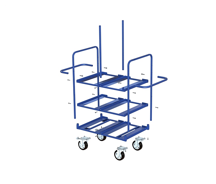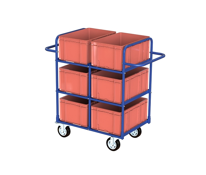 Производственная тележка Нова-склад IS10 предназначена для перемещения грузов, пластиковых ящиков, стандартных евробоксов или картонных коробок внутри складских, торговых и производственных помещений. Опорные поверхности выполнены из листового металла толщиной 1,5 мм. Внимание! Колеса в комплект поставки не входят и приобретаются отдельно. Особенности: