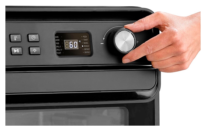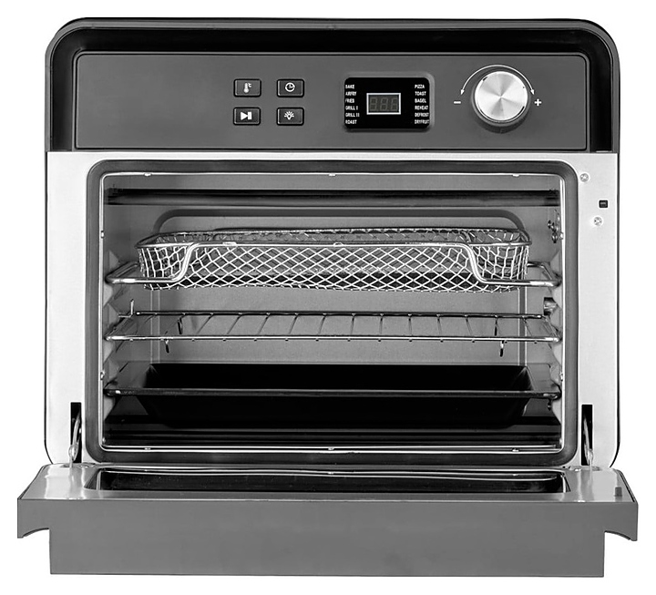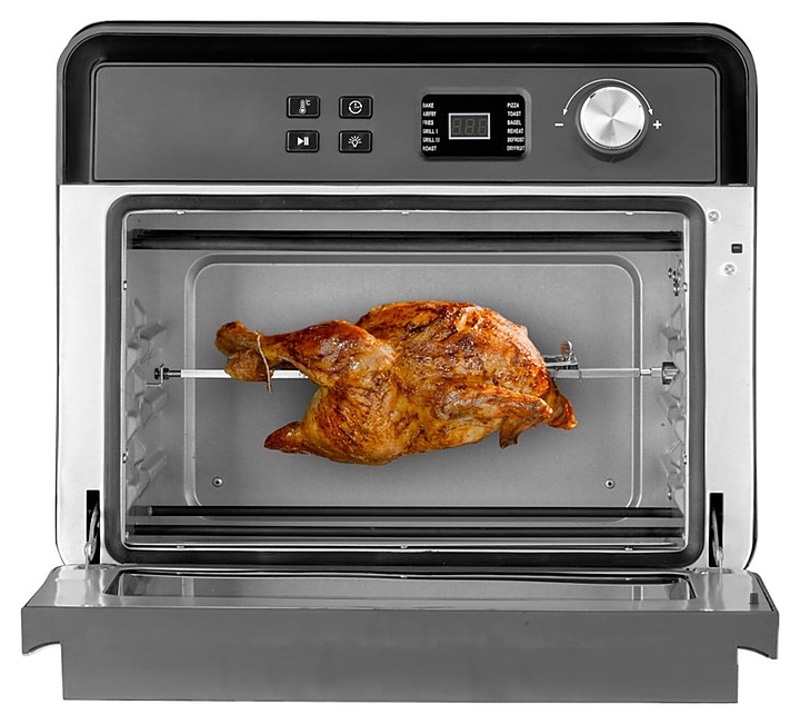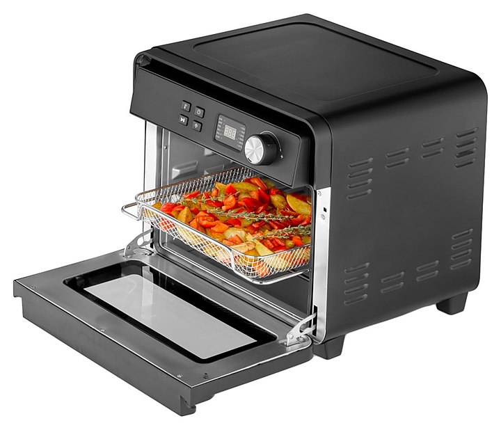 Аэрофритюрница CASO AirFry Chef 1700 предназначена для приготовления различных блюд без использования масла, а также сушки фруктов, ягод и трав в домашних условиях. Модель оснащена 6 нагревательными элементами, откидной дверцей с горизонтальной рукояткой и смотровым окном, камерой с 3 уровнями для установки противней и электромеханической панелью управления с функциональными кнопками, круговым регулятором и информативным дисплеем. Корпус выполнен из стали с покрытием черного цвета, внутренняя облицовка камеры и нагревательные элементы – из нержавеющей стали. В комплект поставки входят решетка для гриля, противень, решетчатая корзина, вертел, съемный поддон для крошек и капель. Особенности: