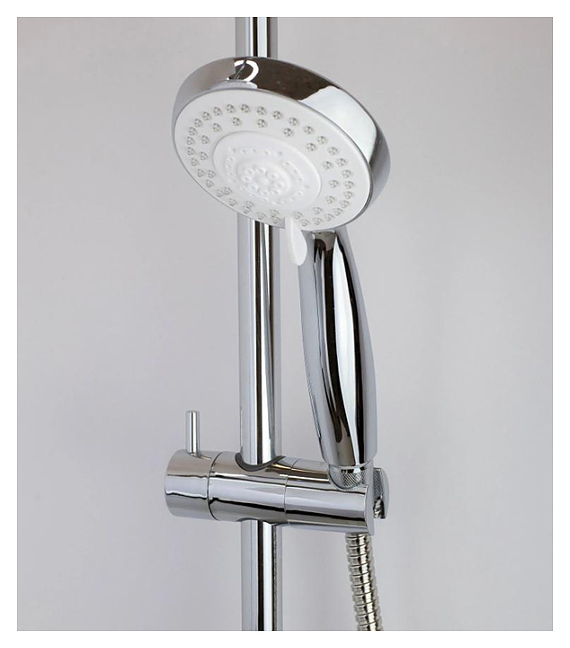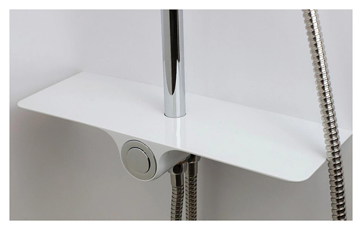 Душевая стойка ESKO ST1010shelf используется в ванных комнатах. Изделие оснащено круглыми верхним душем и ручной лейкой. Модель оборудована полкой для размещения аксессуаров, встроенным дивертором с продвинутым кнопочным управлением и выдвижной телескопической стойкой. Изделие выполнено из нержавеющей стали, отличающейся прочностью и долговечностью, верхний душ - из ABS-пластика. В комплект поставки входят монтажный комплект, душевой шланг и шланг подключения к смесителю. Особенности: