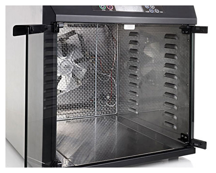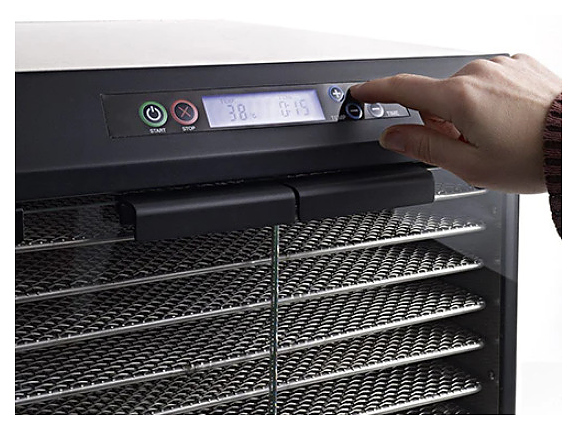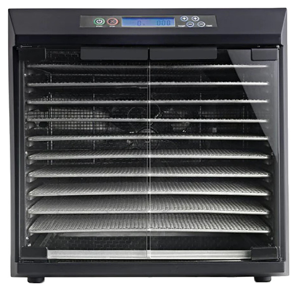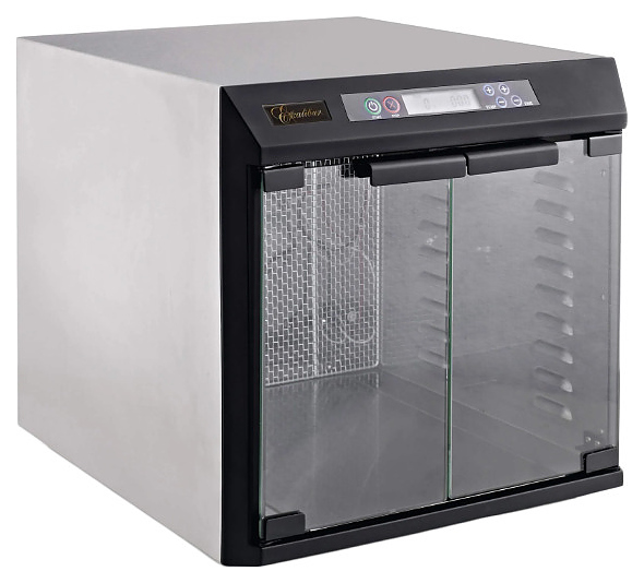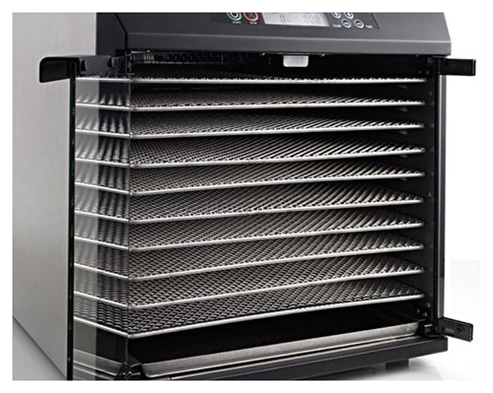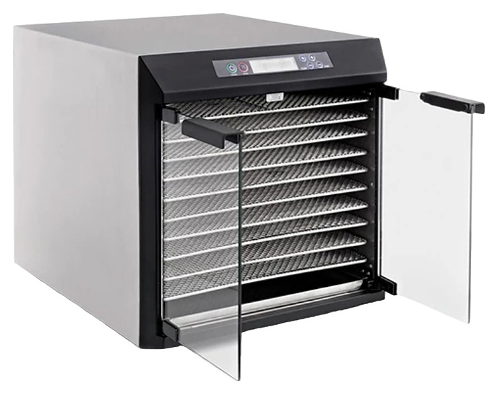 Дегидратор Excalibur EXC10ELF предназначен для сушки овощей, фруктов, ягод, орехов, грибов и трав, расстойки теста, приготовления йогурта, вяления мяса и рыбы на предприятиях общественного питания и в домашних условиях. Модель оснащена расположенными в задней стенке нагревательным элементом и вентилятором, электронным термостатом, распашными дверьми и кнопочной панелью управления с жидкокристаллическим дисплеем. Корпус, внутренняя облицовка камеры, лотки и поддон выполнены из высококачественной нержавеющей стали, фронтальная панель – из пластика черного цвета, двери – из армированного стекла. В комплект поставки входят 10 лотков и поддон для сбора капель. Особенности: