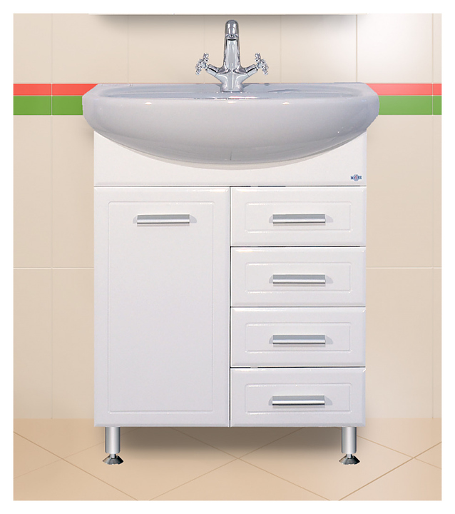 Тумба под раковину Misty Стелла-65 выполнена в современном стиле и идеально впишется в интерьер любой ванной комнаты. Напольная конструкция обеспечивает легкий монтаж и не требует специального ремонта в помещении. Модель оснащена 4 выдвижными ящиками и закрытым вертикальным отделением с бельевой корзиной. Корпус изделия выполнен из ЛДСП, фасад - из МДФ. Тумба может использоваться вместе с раковиной Santek Стелла 65. Комплектация: