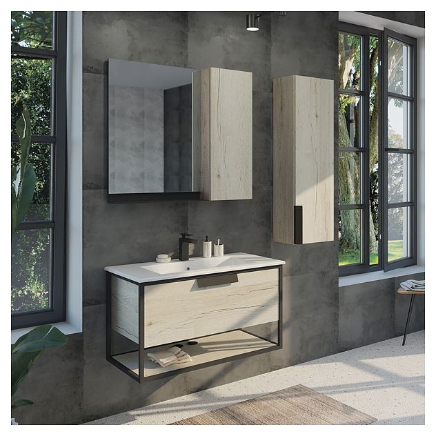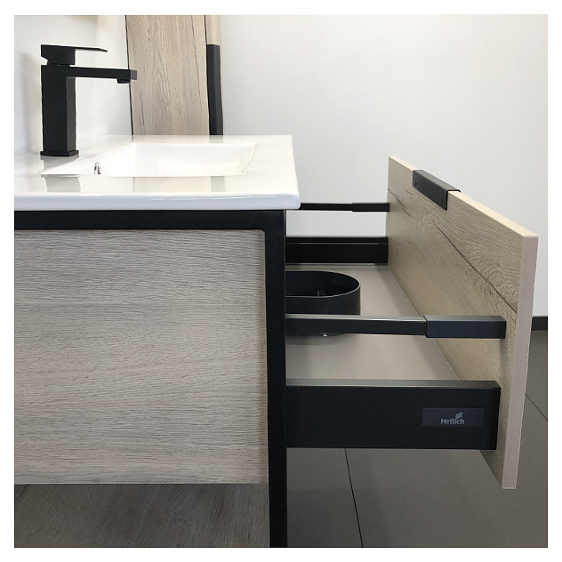 Тумба с раковиной Comforty Бонн-90 дополнит интерьер ванной комнаты. Благодаря подвесной конструкции модель не занимает много места, что экономит пространство и облегчает уборку. Тумба оснащена открытой полкой в нижней части и выдвижным ящиком плавного закрывания с ручкой. Раковина имеет слив-перелив. Тумба выполнена из влагостойкой ЛДСП, каркас - из стали, раковина - из санфарфора, обладающего повышенной прочностью и устойчивостью к негативным внешним факторам, а также долгое время сохраняет идеальную белизну и не впитывает запахи и грязь. В комплект входит белая раковина Sanita Luxe Quadro 90. Дополнительные характеристики: