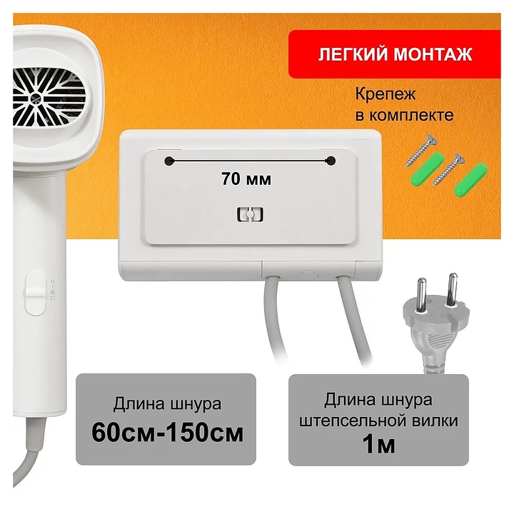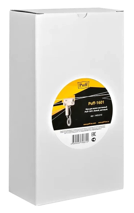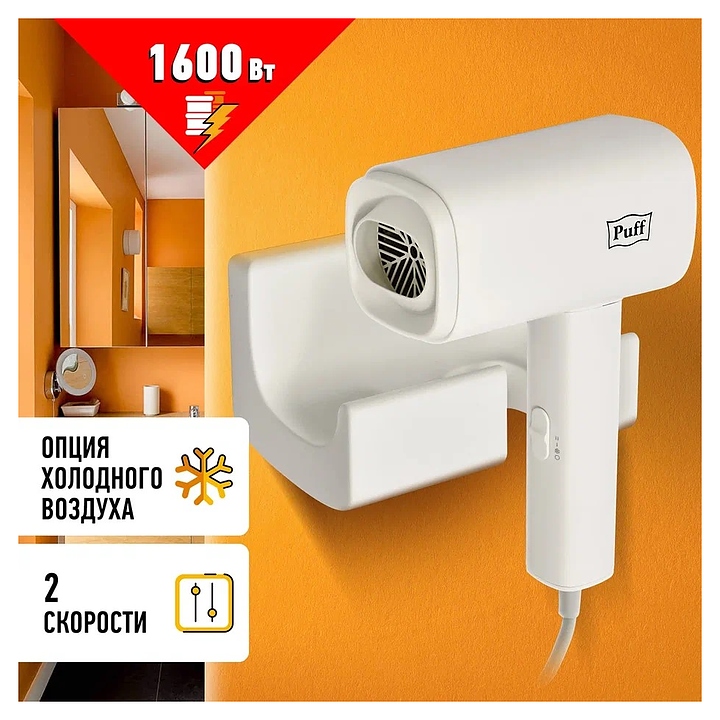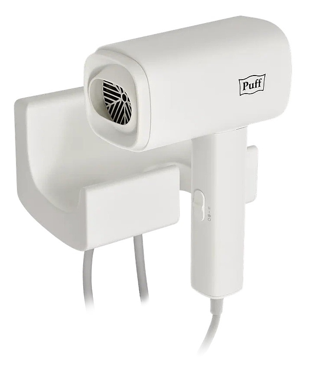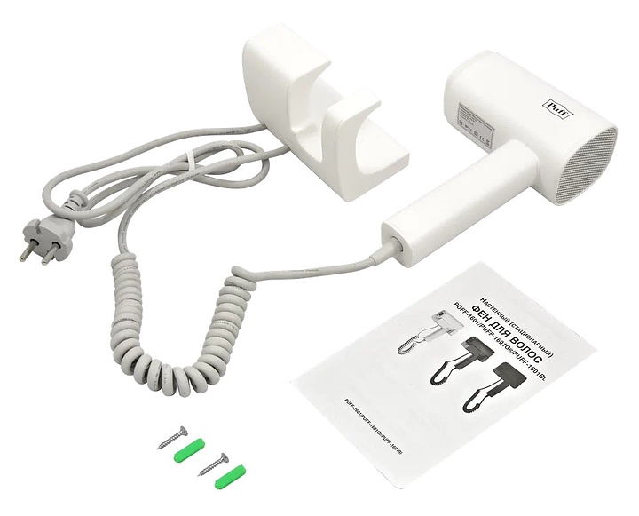 Настенный фен Puff 1601 предназначен для быстрой сушки волос и рук в гостиницах, домах отдыха, спортивных комплексах, бассейнах, а также в домашних условиях. Модель оснащена настенным блоком с углублением и горизонтальным ограничителем для фиксации рукоятки, а также кабелем питания с вилкой. Корпусы изготовлены из ударопрочного АБС-пластика белого цвета. В комплект поставки входят набор монтажных креплений и инструкция по эксплуатации. Особенности: