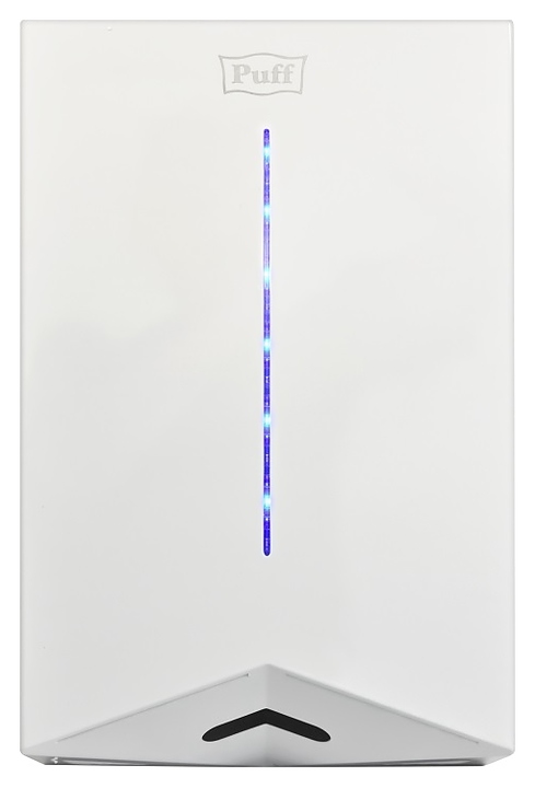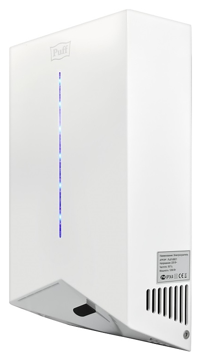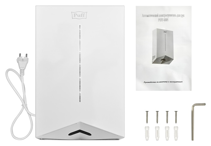Сушилка для рук Puff 8801 используется в туалетных комнатах торговых центров, гостиниц, аэропортов, предприятий общеcтвенного питания и других местах массового пребывания для бесконтактной гигиеничной сушки. Модель оснащена нагревательным элементом, электродвигателем с вентилятором и кабелем питания с вилкой. Корпус выполнен из ударопрочного АБС-пластика белого цвета. В комплект поставки входят набор монтажных креплений, монтажный ключ и инструкция по эксплуатации. Особенности: