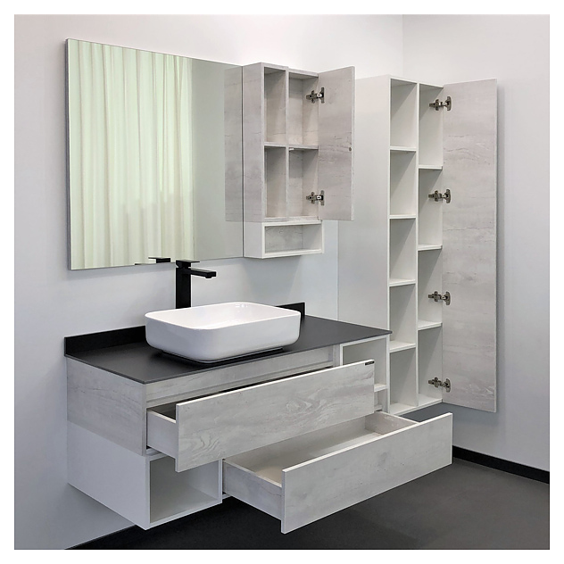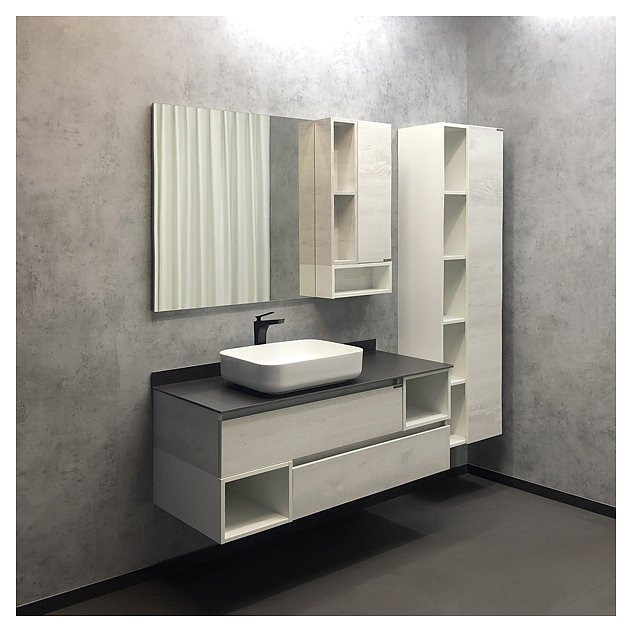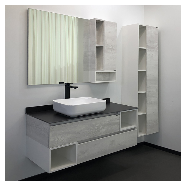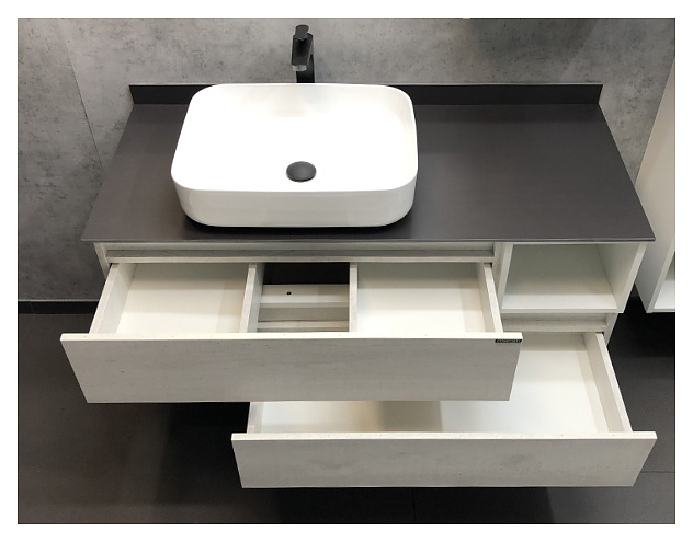 Тумба с раковиной Comforty Прага-120 дополнит интерьер ванной комнаты. Благодаря подвесной конструкции модель не занимает много места, что экономит пространство и облегчает уборку. Тумба оснащена 2 выдвижными ящиками плавного закрывания и открытыми полками в боковых частях. Изделие выполнено из влагостойкой ЛДСП, столешница и плинтус - из керамогранита, раковина - из санфарфора, который обладает повышенной прочностью и устойчивостью к негативным внешним факторам, а также долгое время сохраняет идеальную белизну и не впитывает запахи и грязь. В комплект входят столешница и раковина Comforty T-Y9378. Дополнительные характеристики: