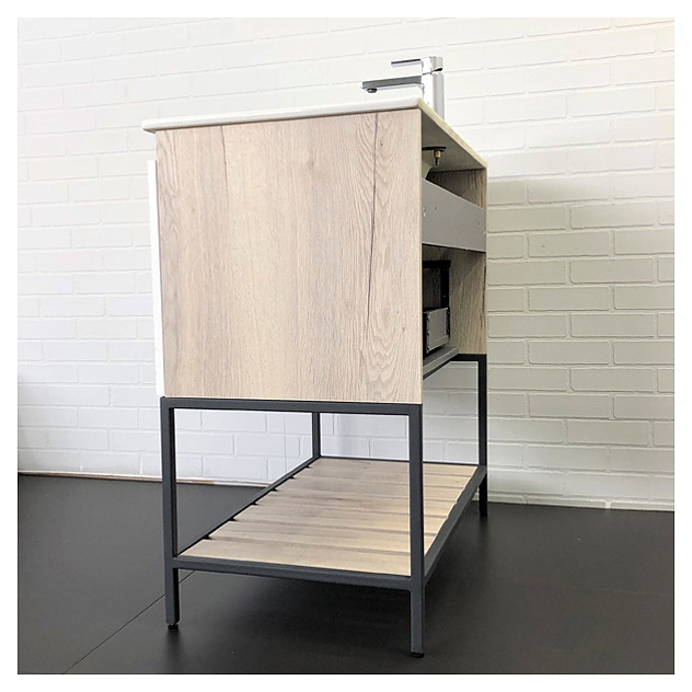 Тумба с раковиной Comforty Страсбург-90 дополнит интерьер ванной комнаты. Модель оснащена выдвижным ящиком плавного закрывания, открытой полкой в нижней части и ножками, защищающими конструкцию в случае намокания пола. Раковина имеет широкие боковые и заднюю поверхности для размещения аксессуаров, слив-перелив и отверстие для смесителя, расположенное посередине. Корпус выполнен из влагостойкой ЛДСП, фасад - из МДФ с покрытием эмалью, каркас - из стали, раковина - из санфарфора, который обладает повышенной прочностью и устойчивостью к негативным внешним факторам, не впитывает запахи и грязь.