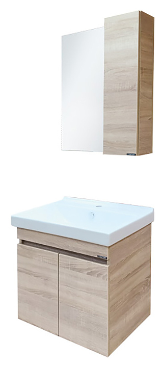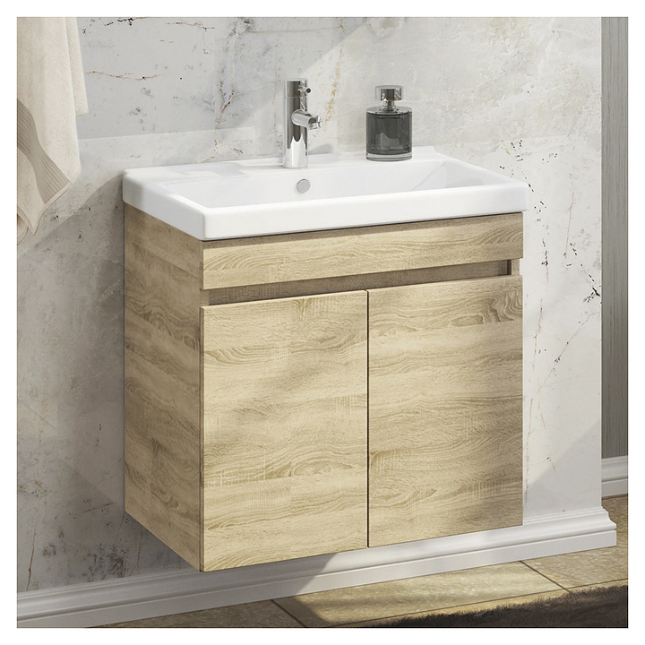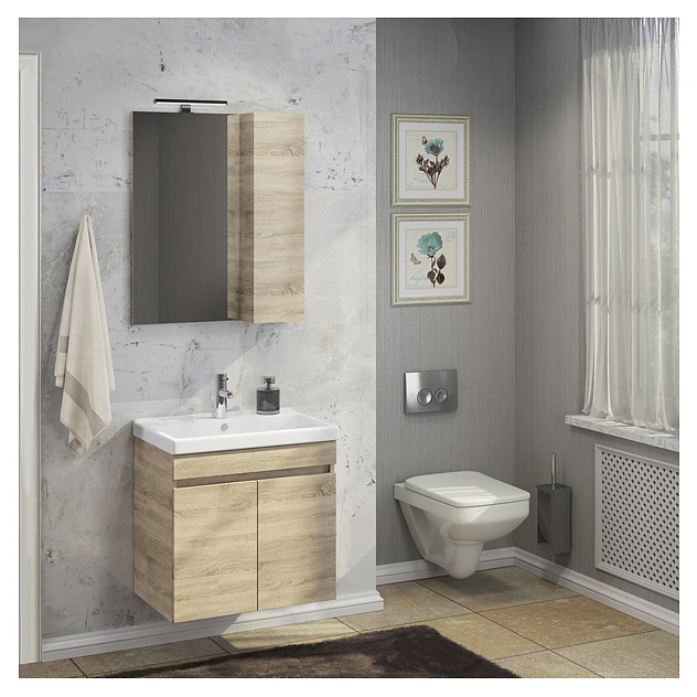 Тумба с раковиной Comforty Тромсе-60 дополнит интерьер ванной комнаты. Благодаря подвесной конструкции модель не занимает много места, что экономит пространство и облегчает уборку. Тумба оснащена 2 распашными дверцами плавного закрывания. Раковина имеет широкую заднюю поверхность для размещения аксессуаров, слив-перелив и отверстие для смесителя. Изделие выполнено из влагостойкой ЛДСП, раковина - из санфарфора, который обладает повышенной прочностью и устойчивостью к негативным внешним факторам, не впитывает запахи и грязь. В комплект входит раковина Fest 60. Дополнительные характеристики: