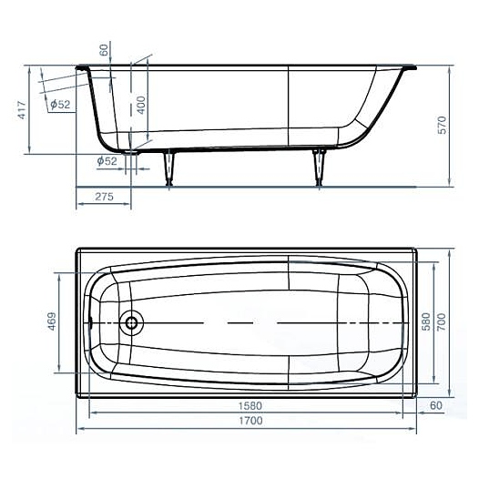 Ванна чугунная Универсал Грация У 170х70 см в/к ножки 1 сорт