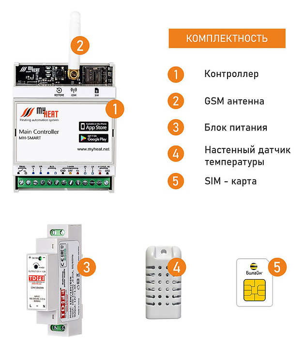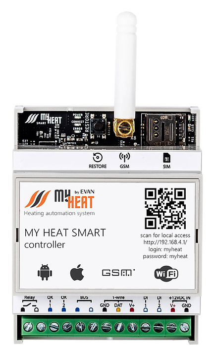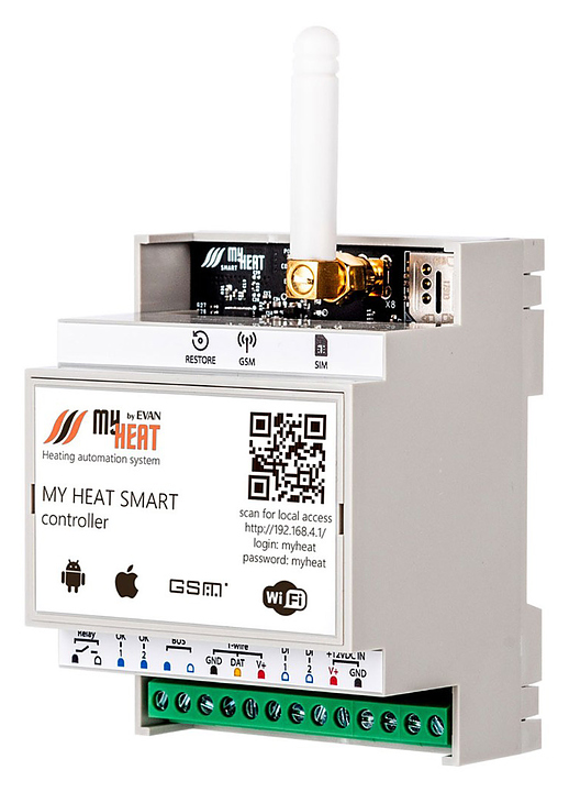 Термостат ЭВАН MY HEAT SMART 6283 предназначен для управления и контроля в удаленном режиме всех параметров работы систем отопления в квартирах с индивидуальным отоплением и небольших частных домовладениях, сбора и хранения информации о нештатных ситуациях, об ее ошибках и SMS и Push оповещение о них. В комплект поставки входит контроллер, проводной комнатный датчик температуры, блок питания, GSM Антенна, SIM карта (Билайн). Особенности: