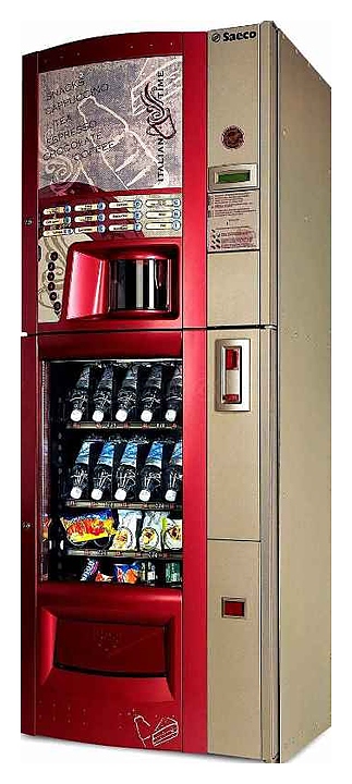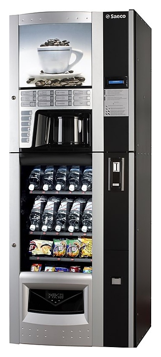 Торговый автомат Saeco Diamante предназначен для размещения в нем горячих напитков и упакованной продукции и позволяет поддерживать необходимую температуру в постоянном режиме. Всевозможные сухарики, чипсы, шоколадные батончики, напитки и орешки помещаются в лотки со спиралями. При вращении спирали выбранный продукт попадает непосредственно в окошко выдачи. Помимо этого аппарат производит напитки на основе кофейных зерен. Благодаря методике приготовления под высоким давлением, кофе имеет непревзойденный натуральный вкус и насыщенный аромат. Кроме того автомат готовит напитки на основе растворимого кофе, а также чай, горячий шоколад, молочные коктейли и бульоны. В комплект поставки входят помпа, провода и трубки. Платежная система, канистра для воды, ёмкость для отходов и реле приобретаются отдельно. Особенности: