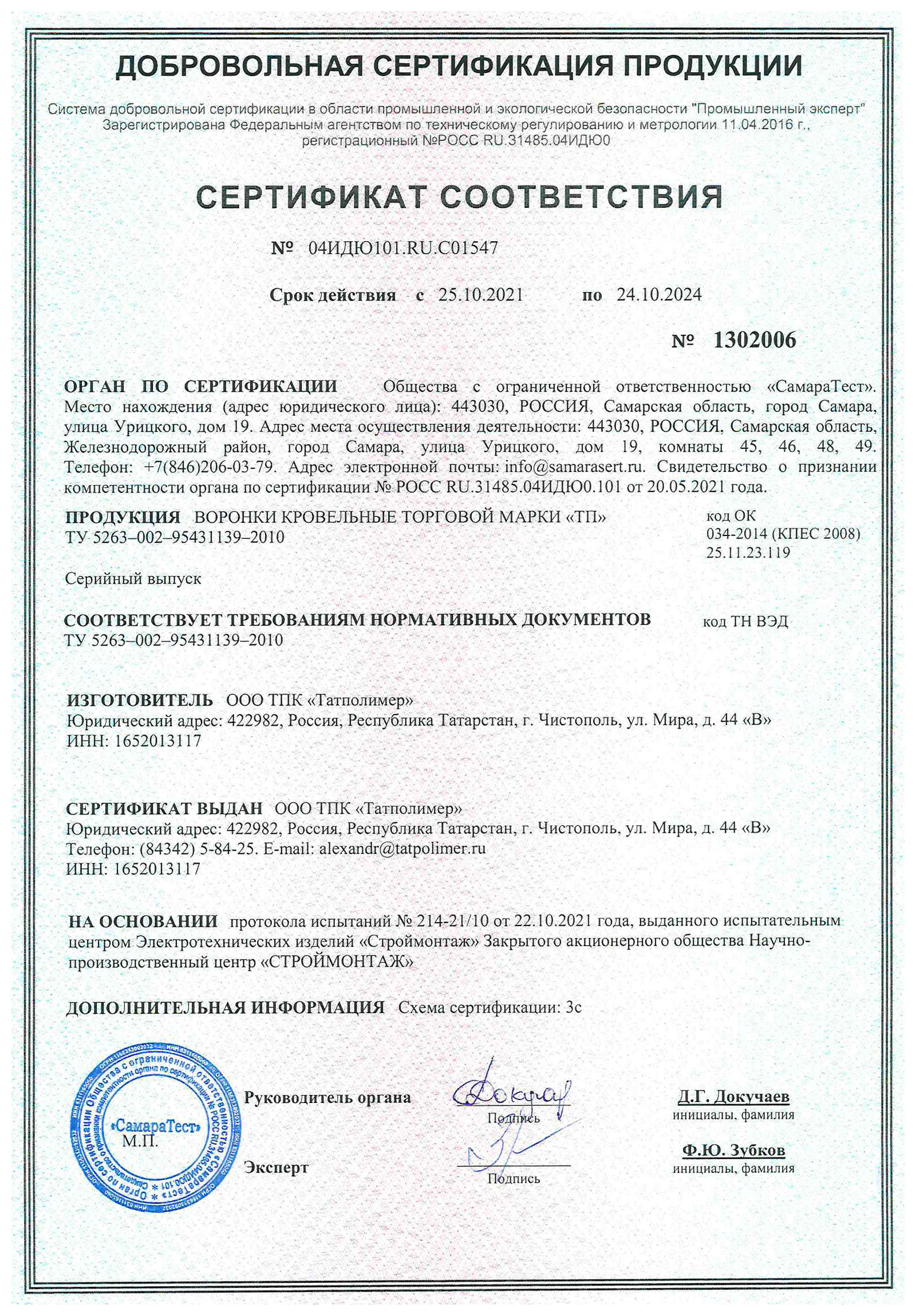 Кровельная воронка Татполимер ТП-01.У.100/4/В-Э с вертикальным выпуском используется для отвода дождевой и талой воды с плоских кровель в дождевую канализацию, для организации внешнего водостока через балконы и парапеты, для аварийного внешнего и внутреннего водостока. Воронка оснащена листвоуловителем для предотвращения попадания веток, листьев и прочего мусора в дождевую канализацию и прижимным и нижним фланцами. Корпус воронки и листвоуловитель изготовлены из полипропилена, устойчивого к ультрафиолетовому и атмосферному воздействию, фланцы - из нержавеющей стали. В комплект поставки входит корпус воронки, нижний и прижимной фланец, набор крепежа (гайки и шайбы), листвоуловитель, обод-фиксатор нагревательного элемента, саморегулирующийся кабель «TRACECO-30». мощностью 15 Вт, битумно-полимерная прокладка. Дополнительные характеристики: