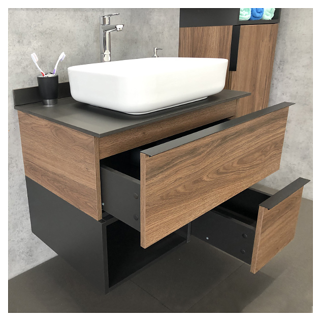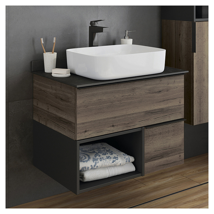 Тумба с раковиной Comforty Штутгарт-75 дополнит интерьер ванной комнаты. Благодаря подвесной конструкции модель не занимает много места, что экономит пространство и облегчает уборку. Тумба оснащена 2 выдвижными ящиками плавного закрывания, открытой полкой в нижней части и ручками. Изделие выполнено из влагостойкой ЛДСП, столешница - из керамогранита, ручки - из алюминия, раковина - из санфарфора, который обладает повышенной прочностью и устойчивостью к негативным внешним факторам, не впитывает запахи и грязь. В комплект входит раковина Comforty T-Y9378. Дополнительные характеристики: