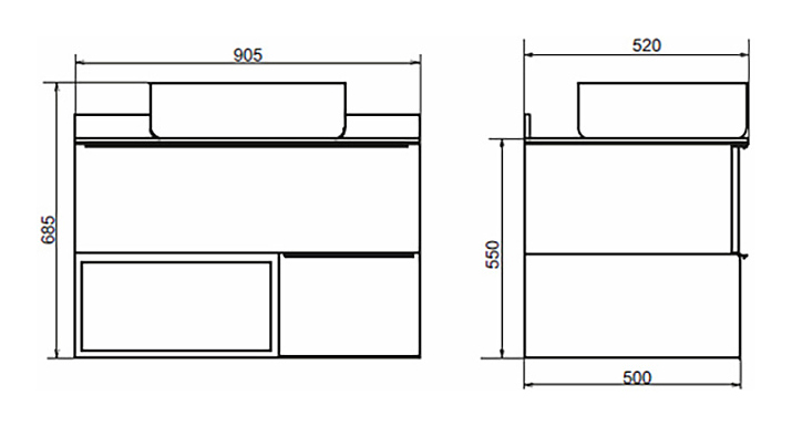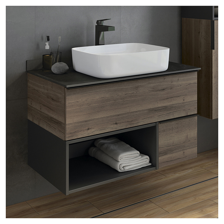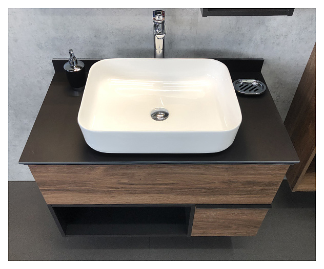 Тумба с раковиной Comforty Штутгарт-90 дополнит интерьер ванной комнаты. Благодаря подвесной конструкции модель не занимает много места, что экономит пространство и облегчает уборку. Тумба оснащена 2 выдвижными ящиками плавного закрывания, открытой полкой в нижней части и ручками. Изделие выполнено из влагостойкой ЛДСП, столешница - из керамогранита, ручки - из алюминия, раковина - из санфарфора, который обладает повышенной прочностью и устойчивостью к негативным внешним факторам, не впитывает запахи и грязь. В комплект входит раковина Comforty T-Y9378. Дополнительные характеристики: