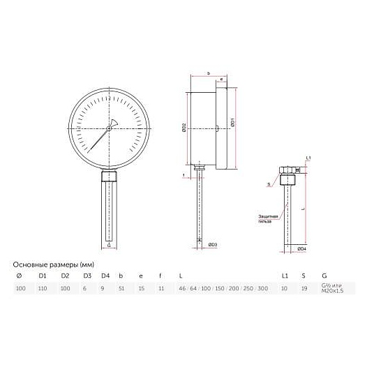 Термометр биметаллический радиальный Росма Дк100 L=64мм G1/2" 120С БТ-52.211
