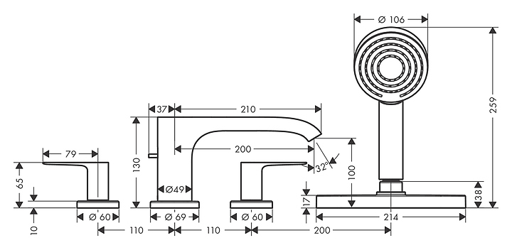 Смеситель для ванны и душа на борт ванны Hansgrohe Vivenis sBox 75444000 на 4 отверстия