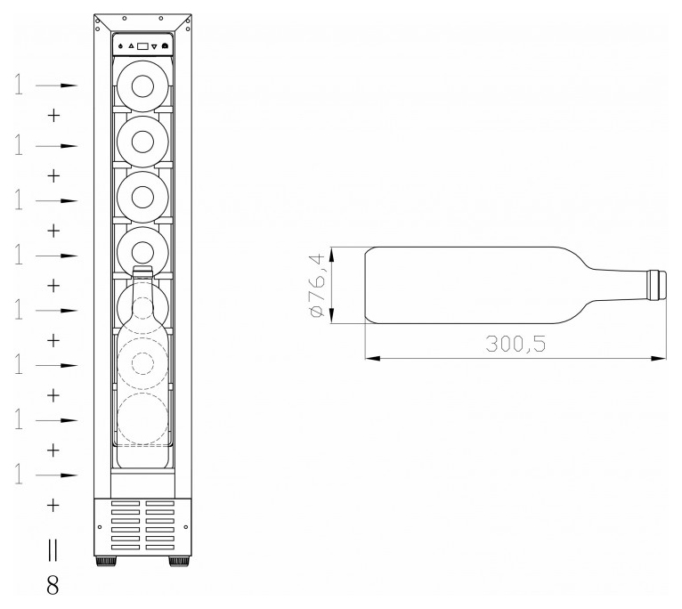 Винный шкаф MEYVEL MV8-KBT1 предназначен для демонстрации, хранения и создания оптимальных условий для сохранения всех вкусовых свойств вина в бутылках на предприятиях общественного питания, торговли, в барах, ресторанах, специализированных магазинах, частных домах или квартирах. Модель оснащена сенсорной панелью управления, электронным термостатом и внутренней синей светодиодной подсветкой. Корпус и дверная ручка выполнены из окрашенной в черный цвет стали, дверь - из двойного стекла с УФ защитой с черной рамкой, полки - из массива бука, ручка двери - из черной стали. В комплект поставки входят петли и набор запасных логотипов для перенавешивания двери. Особенности: