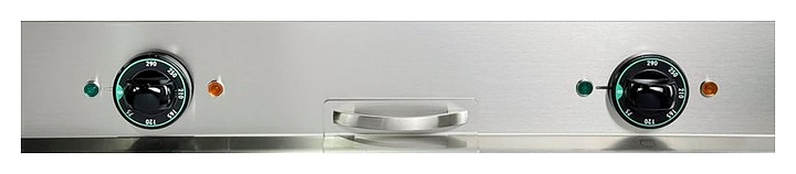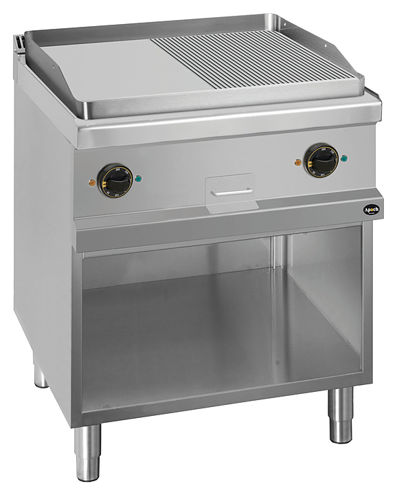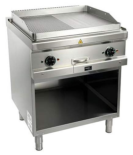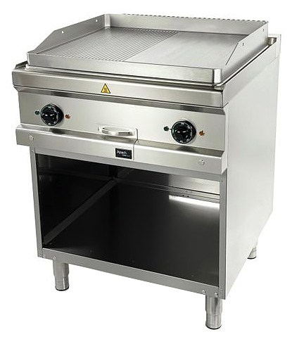 Жарочная поверхность Apach APTE-77PLR/PL 700-й серии предназначена для обжарки мяса, рыбы и овощей на предприятиях общественного питания и торговли. Модель с закругленными краями и бортами оснащена электромеханической панелью управления с 2 терморегуляторами и 4 световыми индикаторами, выдвижным лотком для сбора остатков пищи, масла и жира и открытой подставкой с регулируемыми по высоте ножками. Корпус, панель управления и вытяжная решетка выполнены из нержавеющей стали AISI 304, боковые и задняя панели - из нержавеющей стали AISI 430, лоток - из нержавеющей стали, рабочая поверхность – из конструкционной стали. Дополнительные характеристики: