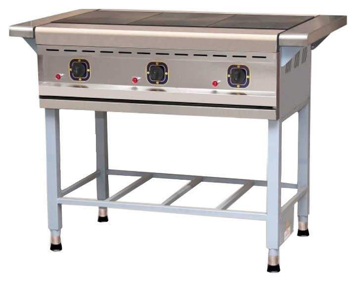 Напольная электрическая плита ONEGA ПЭ-3 Н предназначена для приготовления широкого ассортимента блюд в наплитной посуде в кафе, ресторанах и на других предприятиях общественного питания и торговли. Модель оснащена рабочей поверхностью с 3 варочными зонами, открытой подставкой и фронтальной электромеханической панелью управления. Лицевые элементы корпуса выполнены из нержавеющей стали, задняя стенка – из оцинкованной стали, подставка – из стали с антикоррозийным покрытием, рабочая поверхность – из чугуна. Особенности: