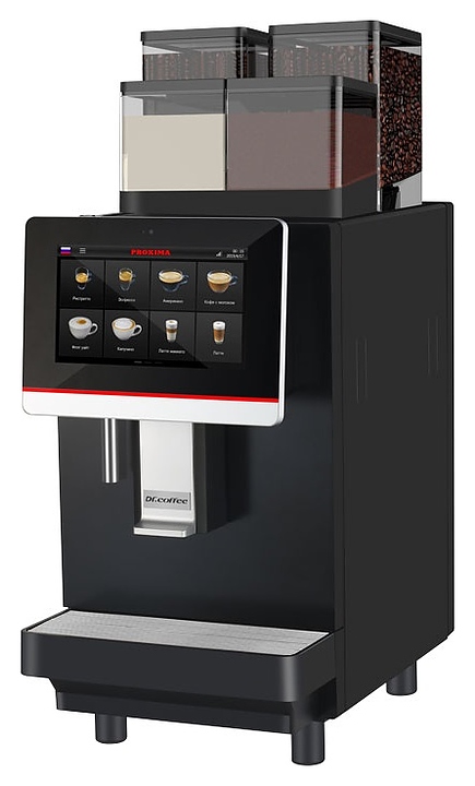 Кофемашина-супкравтомат Dr.coffee Proxima F3 Plus используется на предприятиях общественного питания и торговли для приготовления кофе и напитков на его основе. Модель оснащена большим сенсорным дисплеем с цветным графическим интерфейсом и удобным русифицированным меню. Корпус выполнен из пластика черного цвета, фронтальная панель, окантовка дисплея и диспенсер серебристого цвета, бойлеры – из алюминия, жернова – из керамики, заварное устройство и решетка каплесборника – из металла, другие соприкасающиеся с продуктом компоненты – из металла и высококачественных термостойких полимеров.