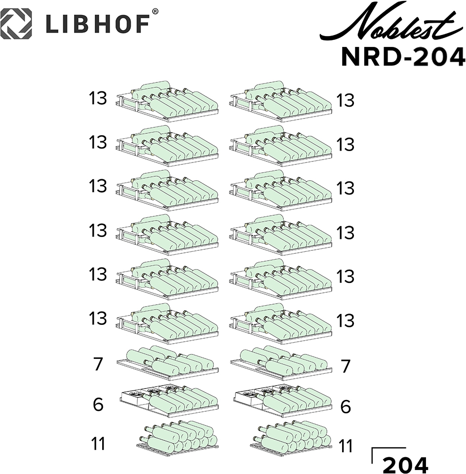 Винный шкаф Libhof Noblest NRD-204 предназначен для хранения при оптимальных условиях бутилированного вина различных сортов в барах, ресторанах, специализированных магазинах, подсобных складских помещениях, а также в домашних условиях. Модель оснащена 2 холодильными камерами с 6 демонстрационными полками в каждой, 2 полками с ванночкой и 2 укороченными полками, распашными дверьми на внутренних петлях с замками, прозрачными обзорными стеклами и сенсорной панелью управления с дисплеем на каждой камере. Корпус выполнен из американского дуба, полки - из массива бука. В комплект поставки входят механические замки с комплектом ключей и емкость для долива воды. Особенности:
