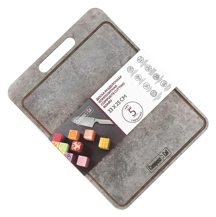 Разделочная доска ComposeEat DRJ3252473031OA4 выполнена из бумажного композитного материала, сохраняющего целостность при падении, ударах и механической нагрузке, устойчивого к резким перепадам температур, не подверженному деформации, выцветанию, сколам, трещинам и механическим повреждениям. Модель оснащена желобом для слива жидкости и отверстием для подвешивания. Особенности: