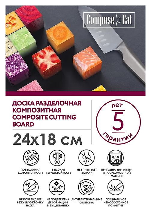 Разделочная доска ComposeEat DRJ2401742094OA4 выполнена из бумажного композитного материала, сохраняющего целостность при падении, ударах и механической нагрузке, устойчивого к резким перепадам температур, не подверженному деформации, выцветанию, сколам, трещинам и механическим повреждениям. Модель оснащена желобом для слива жидкости и отверстием для подвешивания. Особенности:
