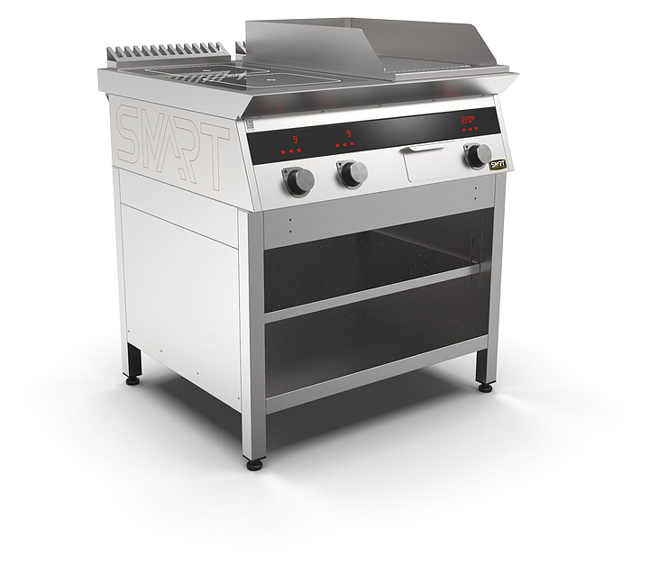 Комбинированная индукционная плита SMART INDUCTION K74-35KRN предназначена для приготовления и быстрого разогрева блюд на предприятиях общественного питания и торговли. Модель оснащена электронно-механической панелью управления с цифровой индикацией и сенсорными кнопками, 2 съемными жировыми фильтрами для отделения жира и влаги от поступающего внутрь аппарата воздуха, ящиком для сбора жира и регулируемыми по высоте ножками. Корпус и столешница выполнены из нержавеющей стали AISI430, рабочая поверхность плиты - из стеклокерамики, рабочая поверхность гриля и передняя панель - из нержавеющей стали. Особенности: