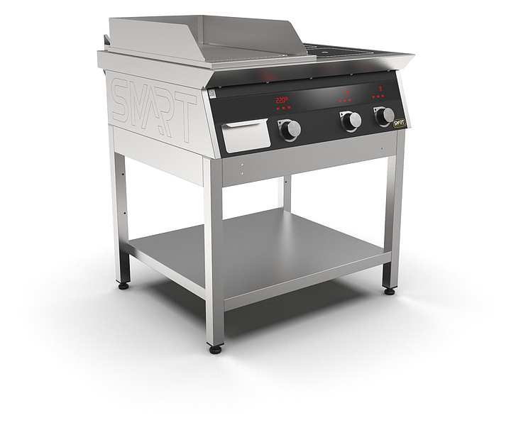 Комбинированная индукционная плита SMART INDUCTION K74-5RKB предназначена для приготовления и быстрого разогрева блюд на предприятиях общественного питания и торговли. Модель оснащена электронно-механической панелью управления с цифровой индикацией и сенсорными кнопками, 2 съемными жировыми фильтрами для отделения жира и влаги от поступающего внутрь аппарата воздуха, ящиком для сбора жира и регулируемыми по высоте ножками. Корпус и столешница выполнены из нержавеющей стали AISI430, рабочая поверхность плиты - из стеклокерамики, рабочая поверхность гриля - из нержавеющей стали, передняя панель имеет стойкое полимерное покрытие черного цвета. Особенности: