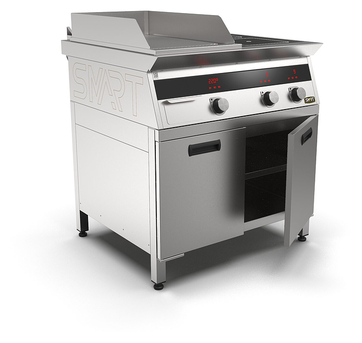 Комбинированная индукционная плита SMART INDUCTION K74-5RKN предназначена для приготовления и быстрого разогрева блюд на предприятиях общественного питания и торговли. Модель оснащена электронно-механической панелью управления с цифровой индикацией и сенсорными кнопками, 2 съемными жировыми фильтрами для отделения жира и влаги от поступающего внутрь аппарата воздуха, ящиком для сбора жира и регулируемыми по высоте ножками. Корпус и столешница выполнены из нержавеющей стали AISI430, рабочая поверхность плиты - из стеклокерамики, рабочая поверхность гриля и передняя панель - из нержавеющей стали. Особенности: