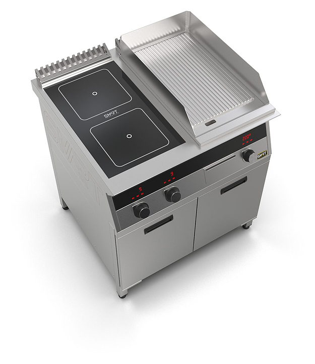 Комбинированная индукционная плита SMART INDUCTION K94-3KRN предназначена для приготовления и быстрого разогрева блюд на предприятиях общественного питания и торговли. Модель оснащена электронно-механической панелью управления с цифровой индикацией и сенсорными кнопками, 2 съемными жировыми фильтрами для отделения жира и влаги от поступающего внутрь аппарата воздуха, ящиком для сбора жира и регулируемыми по высоте ножками. Корпус и столешница выполнены из нержавеющей стали AISI430, рабочая поверхность плиты - из стеклокерамики, рабочая поверхность гриля и передняя панель - из нержавеющей стали. Особенности: