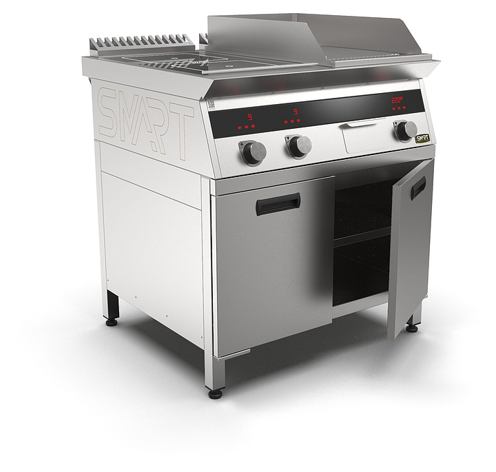 Комбинированная индукционная плита SMART INDUCTION K94-35KRN предназначена для приготовления и быстрого разогрева блюд на предприятиях общественного питания и торговли. Модель оснащена электронно-механической панелью управления с цифровой индикацией и сенсорными кнопками, 2 съемными жировыми фильтрами для отделения жира и влаги от поступающего внутрь аппарата воздуха, ящиком для сбора жира и регулируемыми по высоте ножками. Корпус и столешница выполнены из нержавеющей стали AISI430, рабочая поверхность плиты - из стеклокерамики, рабочая поверхность гриля и передняя панель - из нержавеющей стали. Особенности: