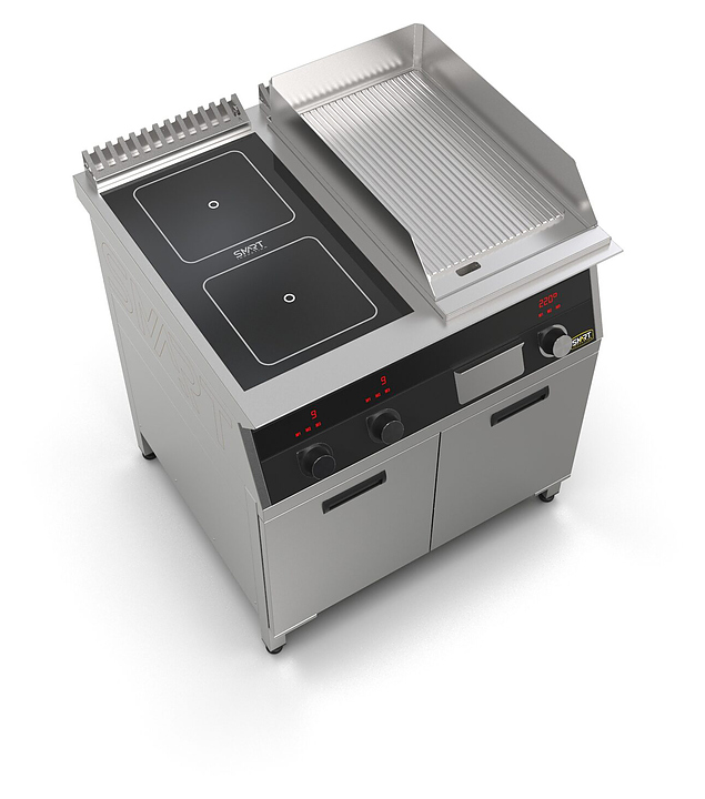 Комбинированная индукционная плита SMART INDUCTION K94-5KRB предназначена для приготовления и быстрого разогрева блюд на предприятиях общественного питания и торговли. Модель оснащена электронно-механической панелью управления с цифровой индикацией и сенсорными кнопками, 2 съемными жировыми фильтрами для отделения жира и влаги от поступающего внутрь аппарата воздуха, ящиком для сбора жира и регулируемыми по высоте ножками. Корпус и столешница выполнены из нержавеющей стали AISI430, рабочая поверхность плиты - из стеклокерамики, рабочая поверхность гриля - из нержавеющей стали, передняя панель имеет стойкое полимерное покрытие черного цвета. Особенности: